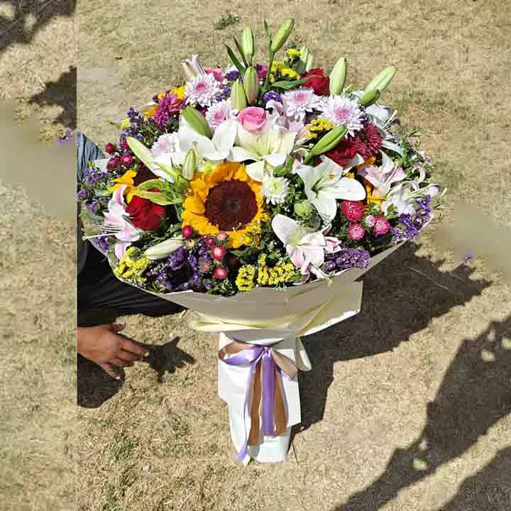 Send Sunshine Celebration with this beautiful Exotic Mixed Flower Bouquet featuring cheerful Sunflowers, Lilies, and vibrant Imported Roses. It’s the perfect Birthday Flowers or Thank You gift. This arrangement is large and round, maximizing visual impact. Trust our service for the fastest Flower Delivery in Rawalpindi and Islamabad. We offer reliable Same-day delivery to all areas.